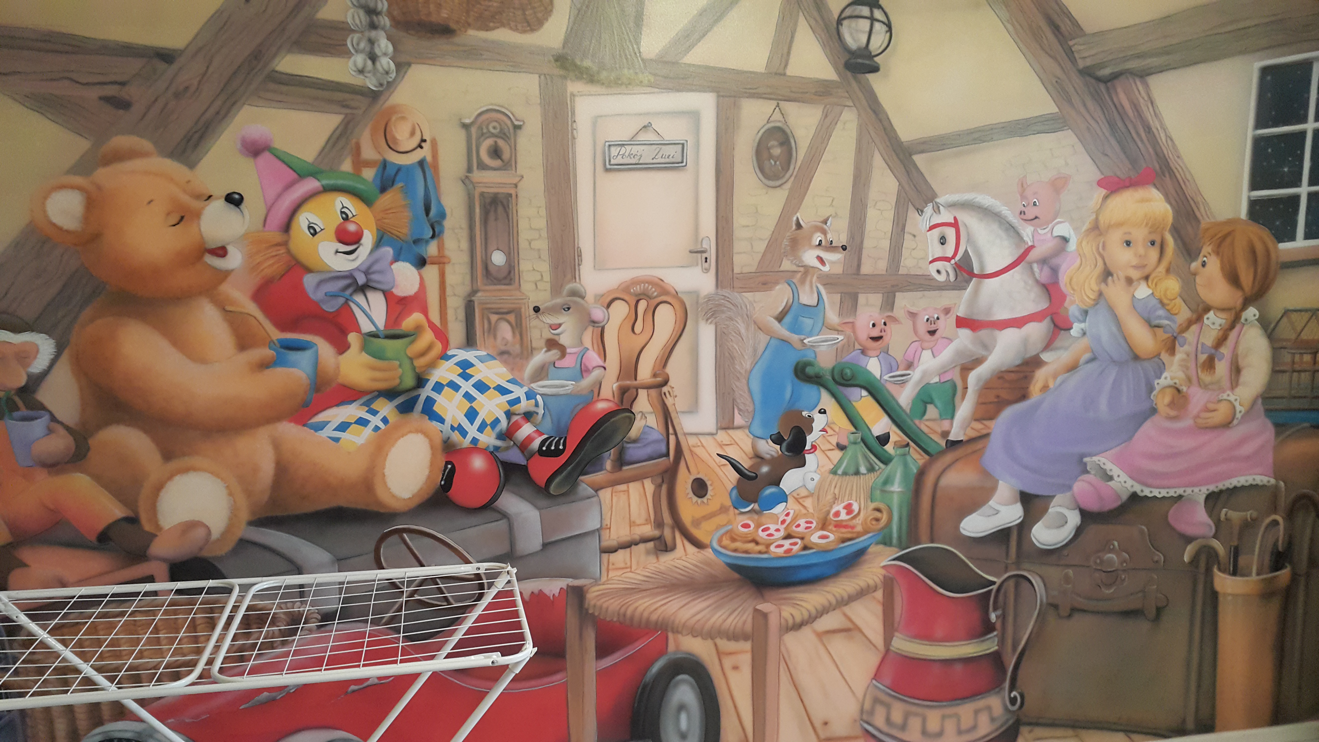 Artystyczne malowanie ścian – tematem tego muralu jest ulica, budynki, oraz płynące po niebie chmury, czyli iluzja rzeczywistego fragmentu miasta. Najważniejszym elementem jest uliczka namalowana na ścianie. Została tu zastosowana perspektywa linearna, gdzie wszystkie linie zbiegają się centralnie do jednego punktu. Na pierwszym, a także na dalszych planach mamy oddalające się od naszego wzroku fasady budynków. Okna, a także reszta elementów budynków stają się coraz mniejsze, a na samym końcu uliczki równolegle do skraju ściany mamy budynek z brązową dachówką. Obraz jest statyczny. Dominują tu ciepłe, przygaszone barwy, głównie brązy, żółcienie, biel, szarości, a także błękit. Światło pada z góry, jest rozproszone, miękko układa się na fasadach budynków, a także na uliczce. Na sąsiednich ścianach mamy elewację budynków przedstawioną w skali 1:1, w jedną ze ścian wpisują się drzwi, a w drugą „prawdziwe” okno. Również w malowidle, w głębi uliczki została namalowana taka sama latarenka, jak kinkiety znajdujące się w pomieszczeniu. Ten zabieg doskonale przyczynił się do stworzenia złudzenia optycznego, dał poczucie „namacalności” całej uliczki.
