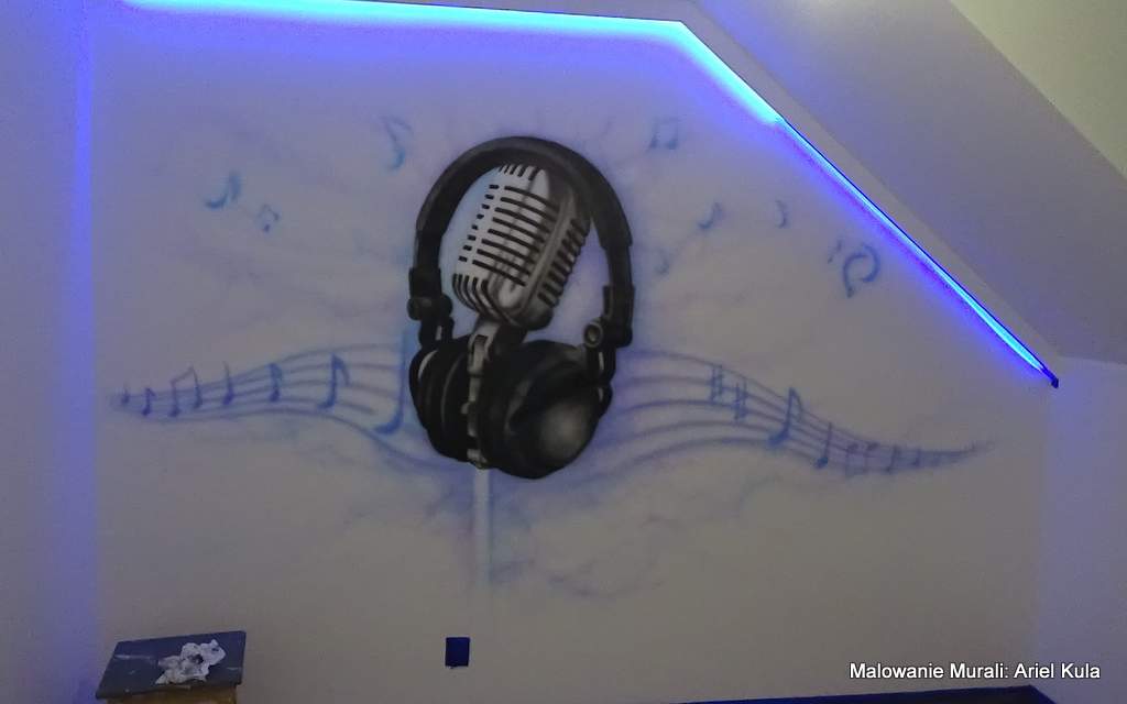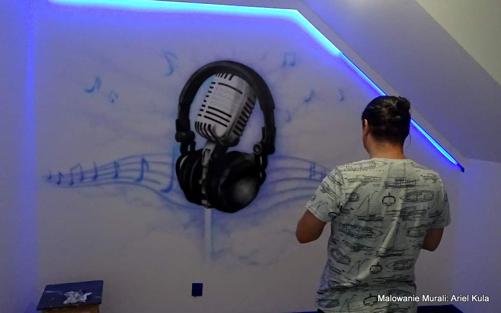 Światłocień i iluzja przestrzeni Artysta mistrzowsko operuje światłem, tworząc iluzję trójwymiarowości na płaskiej ścianie. Delikatne, rozproszone światło padające z lewej strony rzeźbi kształty mikrofonu i słuchawek, nadając im realizmu. Prawa strona, pogrążona w subtelnym cieniu, potęguje wrażenie głębi. Zastosowanie perspektywy powietrznej, gdzie dalsze elementy kompozycji są delikatnie zamglone, sprawia, że mural „oddycha” i optycznie powiększa pokój.