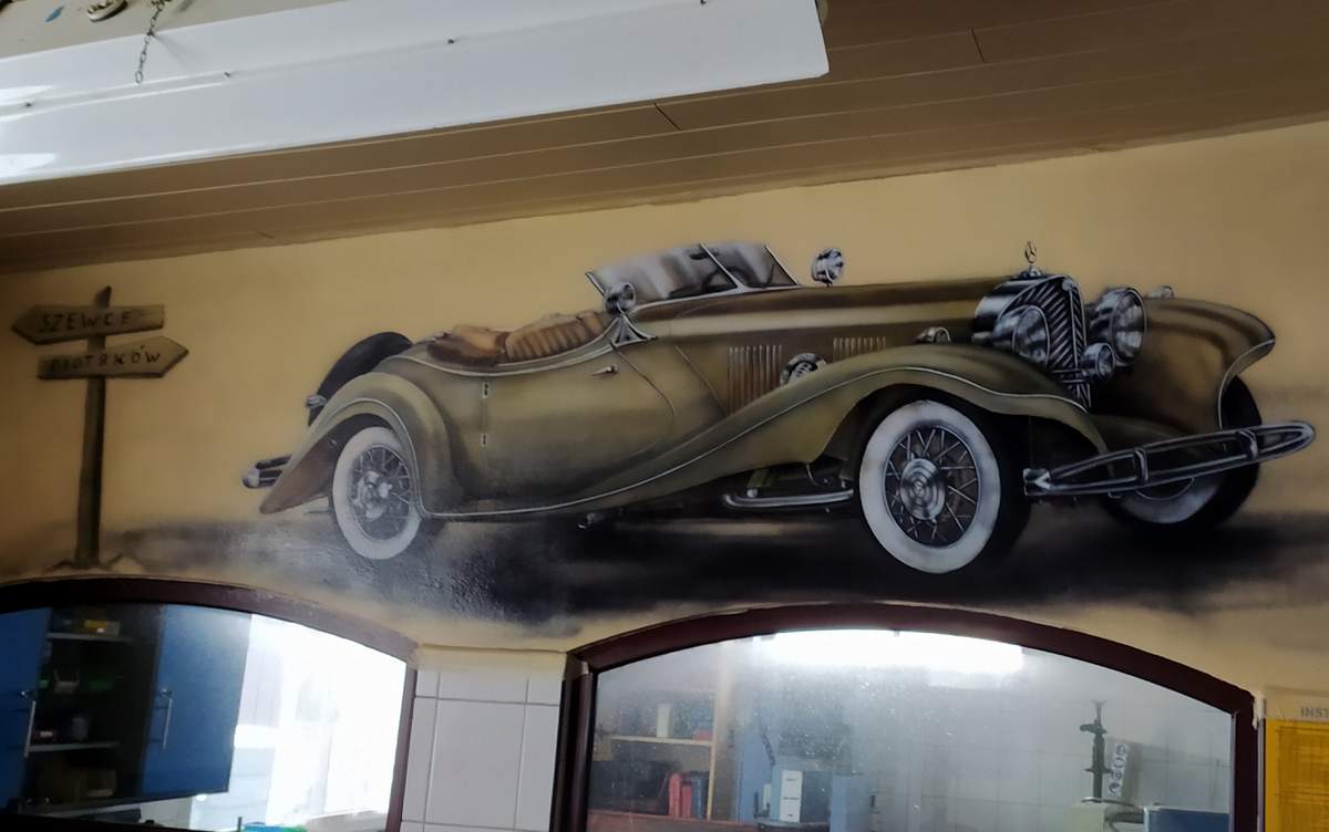 - Malowanie samochodu – mural w warsztacie samochodowym